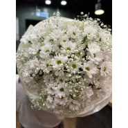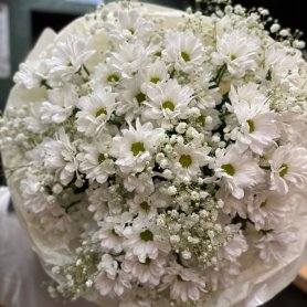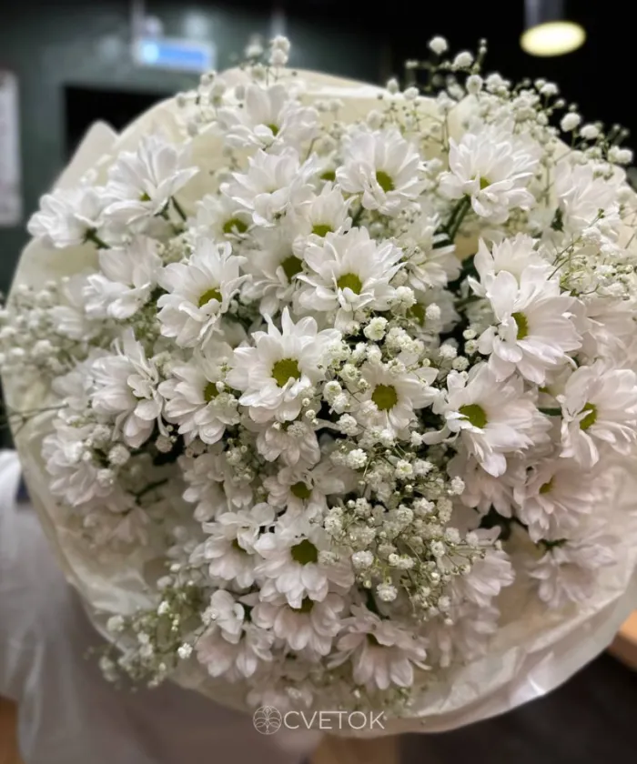 Этот букет символ чистоты и нежности, словно облако из белых хризантем, тонко обрамленное невесомыми веточками гипсофилы. Он идеально подходит для выражения самых искренних чувств и создания атмосферы утонченности.